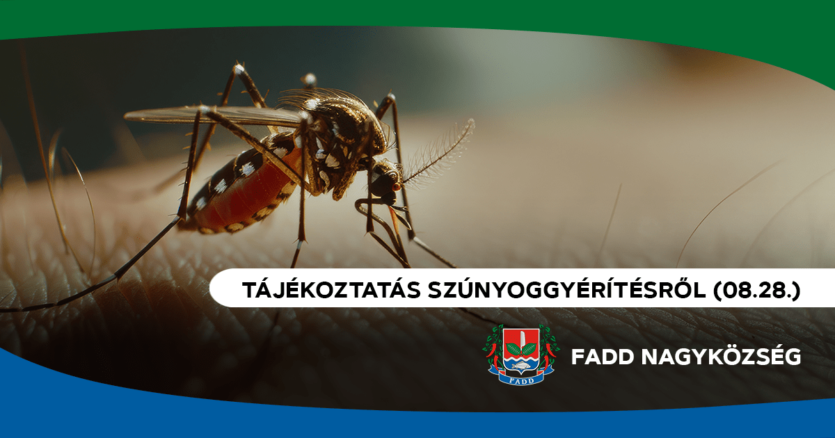 Ezúton értesítjük lakosainkat, hogy településünkön 2025. augusztus 28-án a napnyugta utáni időszakban földi úton történő szúnyoggyérítés várható. Pótnapok: 2025. augusztus 29-30. napjai, ugyanebben az időben.